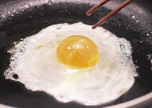 假蛋放入鍋中油煎,除了蛋白氣泡比真蛋多之外,賣相甚至比真蛋還可 口