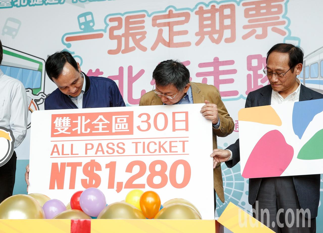 雙北推動捷運、公車定期票,即所謂「30 天吃到飽月票」,台北市長柯文哲、新北市長朱立倫今天共同宣布,月票 1,280 元、4 月 16 日正式上線;台北市長柯文哲受訪時表示,月票推出後,初估一年需編列 9.4 億元預算補貼,由雙北市庫一同支付。