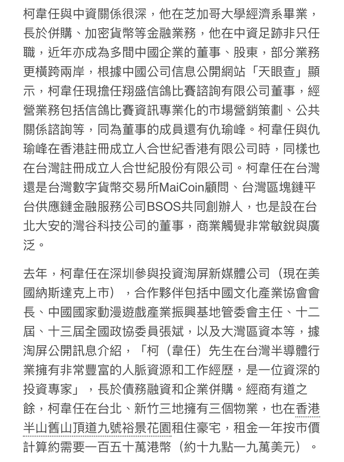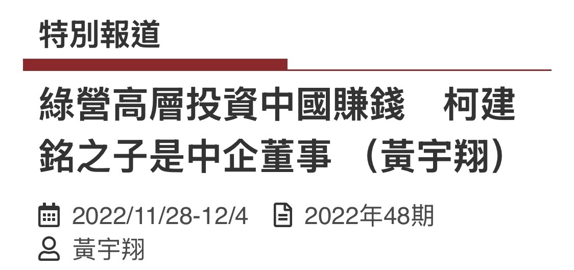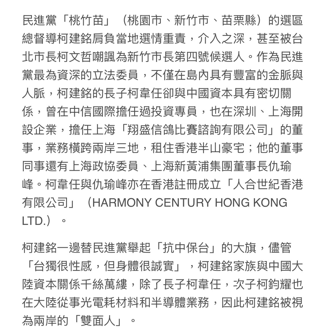 柯建銘的長子柯韋任卻與中國資本具有密切關係,曾在中信國際擔任過投資專員,也在深圳、上海開設企業,擔任上海「翔盛信鴿比賽諮詢有限公司」的董事,業務橫跨兩岸三地,租住香港半山豪宅;他的董事同事還有上海政協委員、上海新黃浦集團董事長仇瑜峰。柯韋任與仇瑜峰亦在香港註冊成立「人合世紀香港有限公司」(HARMONY CENTURY HONG KONG LTD.)。