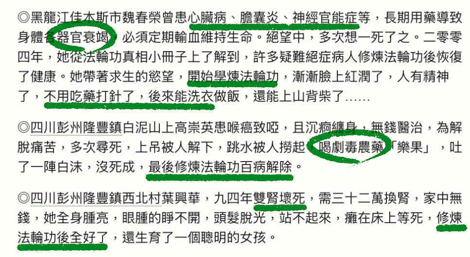 ….九四年雙腎壞死,需三十二萬換腎,家中無錢,她全身腫亮,眼腫的睜不開,頭髮脫光,站不起來,癱在床上等死,修煉法輪功後全好了….