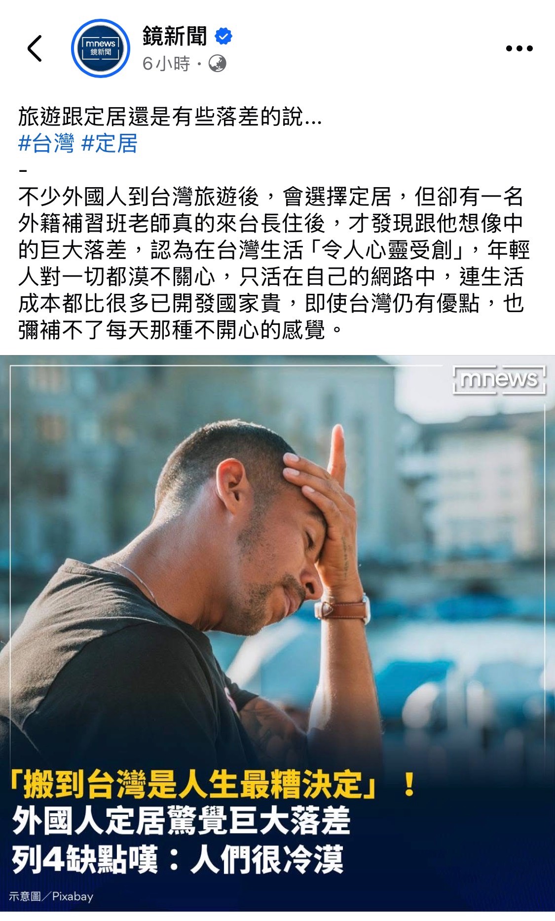 一名外籍人士吐露在台灣生活與補習班工作的經歷,原本因為旅遊而愛上台灣,但真正定居後卻讓他心力交瘁,甚至認為在台灣生活「令人心靈受創」。他提到,大家都說台灣人友善,實際上卻很被動,在職場中則給人居高臨下、愛挑毛病的態度,而台灣的年輕人對一切都很漠視,活在自己的網路中。