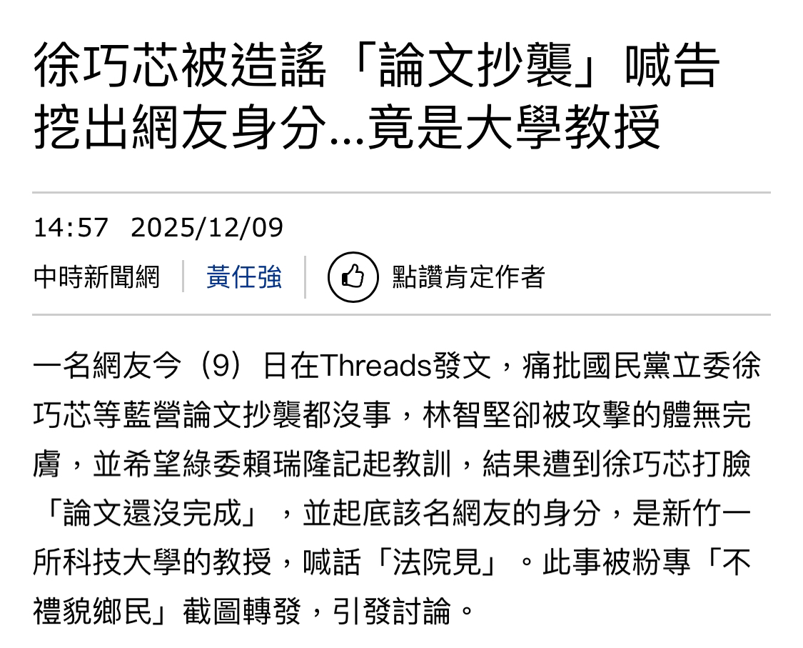 對此,徐巧芯在該篇貼文底下回應,透露自己正在準備論文「研究計畫」而已,根本不可能有抄襲的可能,痛批莫名其妙、造謠沒下限,而且造謠的人還是一名教授。